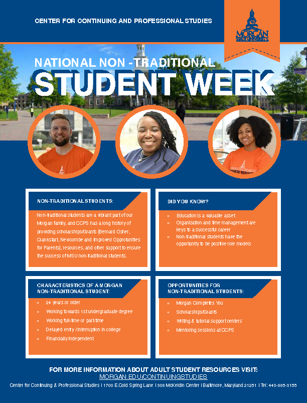 Non-traditional students are a vibrant part of our Morgan family, and The Center for Continuing and Professional Studies (CCPS) has a long history of providing scholarships/Grants (Bernard Osher, Crankstart, Beryl W. Williams, Newcombe and Improved Opportunities for Parents), resources, and other supports to ensure the success of MSU non-traditional students.