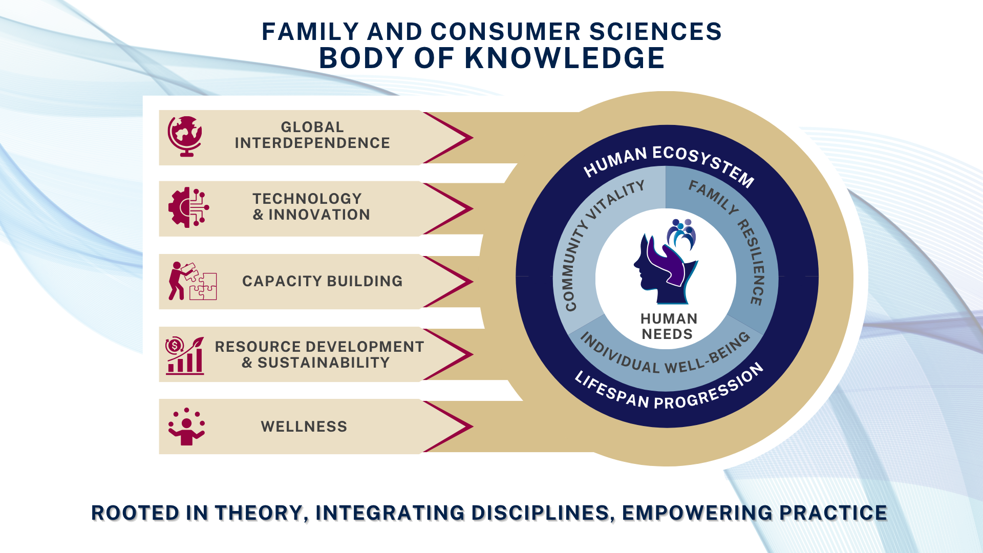 The Family and Consumer Sciences (FCS) Body of Knowledge establishes the framework that serves as the foundation for the field. It provides a blueprint through which FCS professionals communicate, research, and practice the professional and through understanding and application of the Body of Knowledge, FCS professionals may enhance individual well-being, build community vitality, and grow global independence.