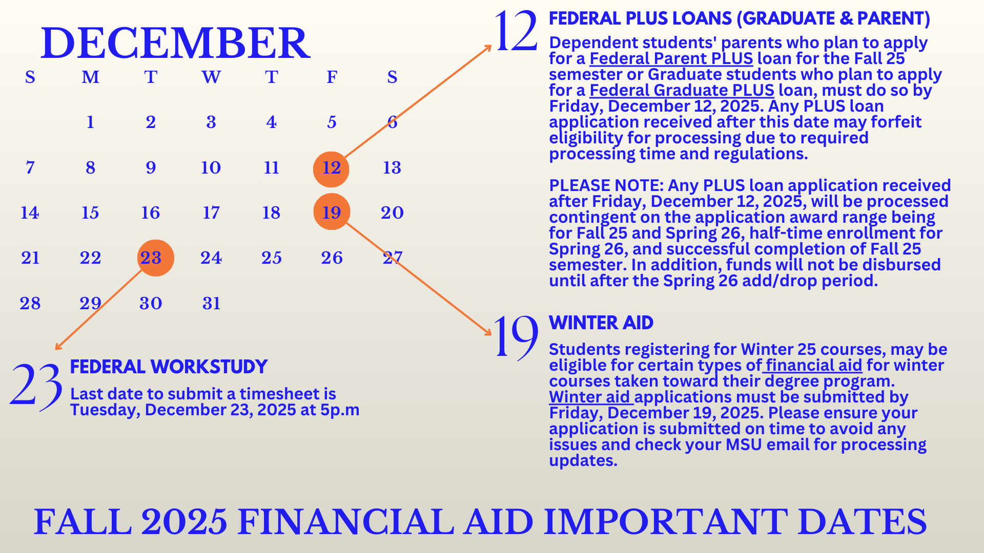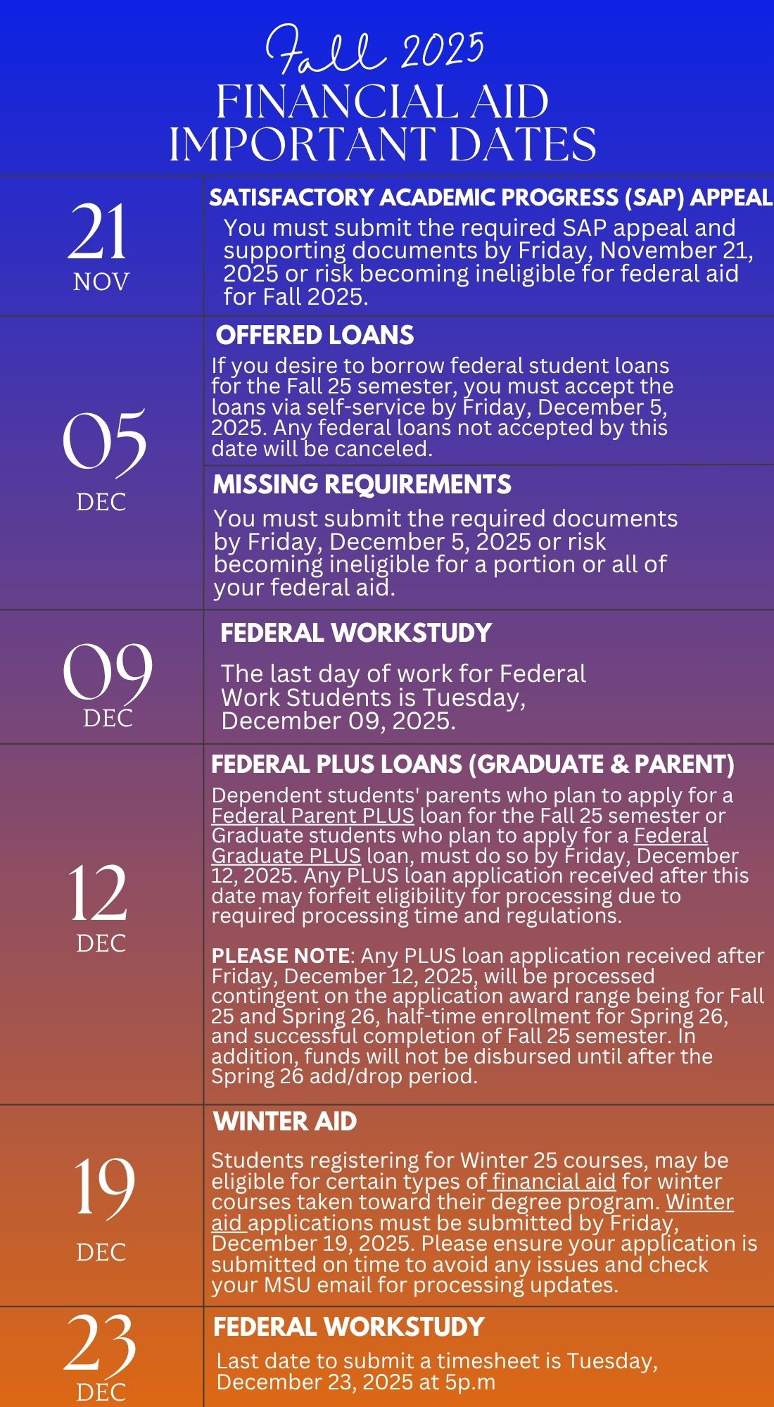 Students registering for Winter 2026 courses, may be eligible for certain types of financial aid for winter courses taken toward their degree program. Winter aid applications must be submitted by Friday, December 19, 2025. Please ensure your application is submitted on time to avoid any issues and check your MSU email for processing updates.