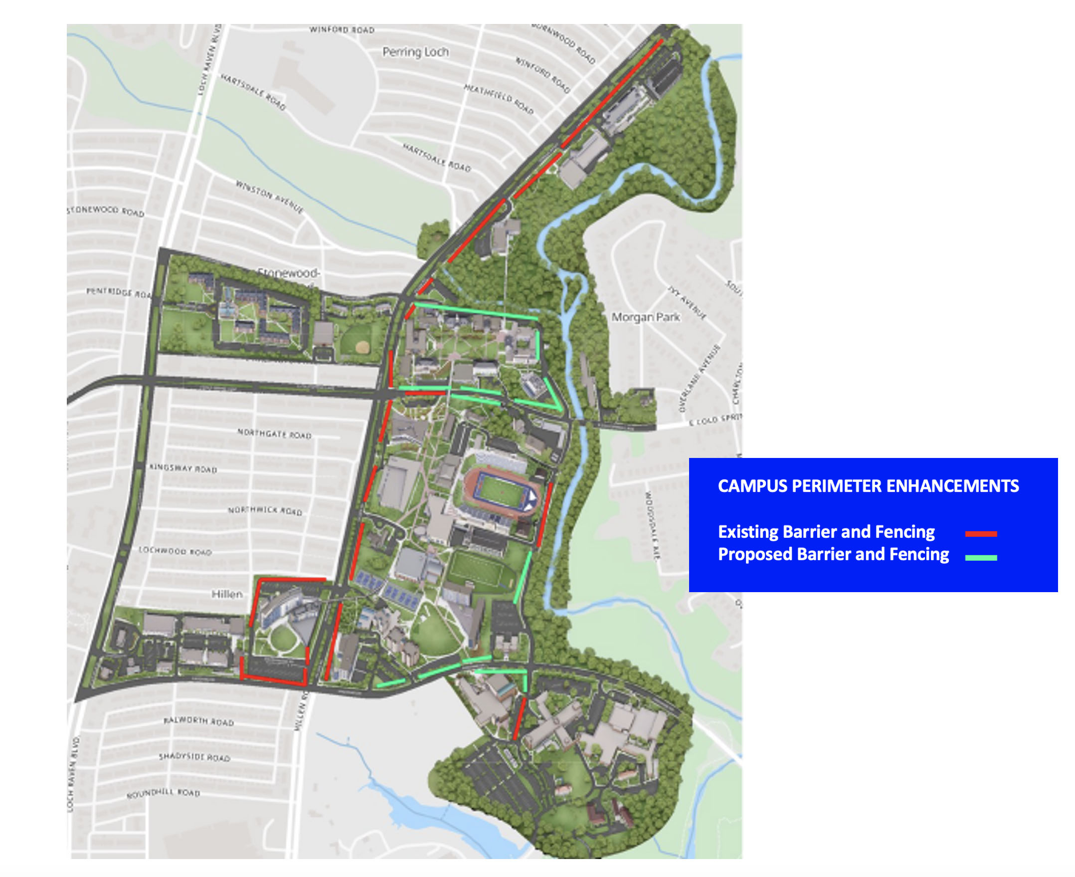 Creating a perimeter structure around Morgan’s campus has been a key component of the University’s design and construction strategy for nearly 10 years. The effort has comprised a careful and thoughtful mix of planned construction in which new buildings and facilities have been erected along the perimeter of the campus with aesthetically pleasing fencing forming a continuous barrier along the campus perimeter. This measure has substantially decreased unfettered pedestrian access to the campus while also creating more defined points of entry (and exit) allowing Public Safety personnel greater jurisdiction over the ingress and egress to Morgan’s campus. To date, more than 60% of the fencing barrier is complete.