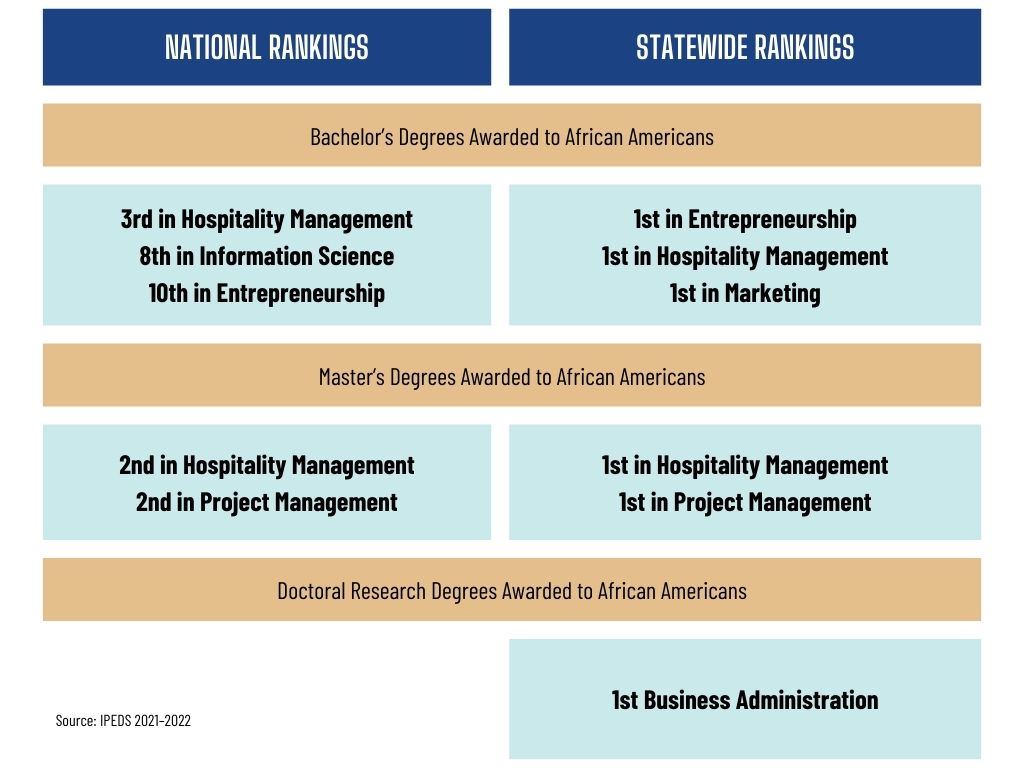 (Chart pictured above: NATIONAL RANKINGS: Bachelor’s Degrees Awarded to African Americans - 3rd Hospitality Management, 8th Information Science, 10th Entrepreneurship; Master’s Degrees Awarded to African Americans - 2nd Hospitality Management, 2nd Project Management; STATEWIDE RANKINGS: Bachelor’s Degrees Awarded to African Americans - 1st Entrepreneurship, 1st Hospitality Management, 1st Marketing; Master’s Degrees Awarded to African Americans - 1st Hospitality Management, 1st Project Management, Doctoral Research Degrees Awarded to African Americans - 1st Business Administration -- Source: IPEDS 2021–2022)