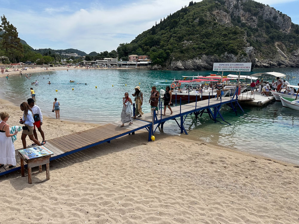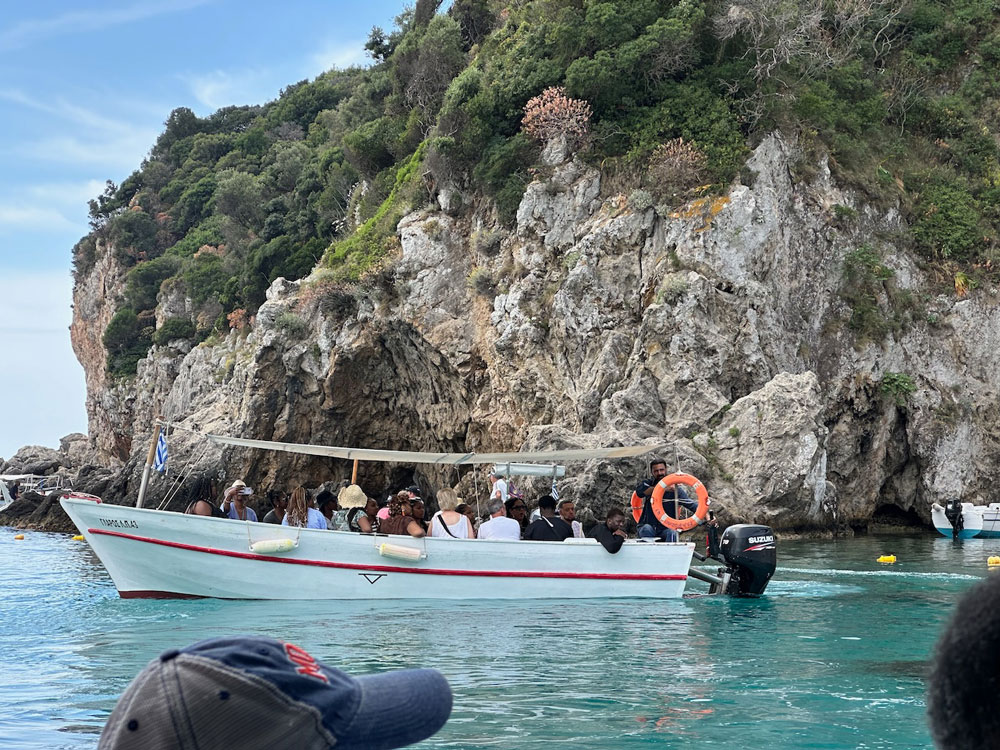 We started the day at a beach in Paleokastritsa. We have noticed that virtually all of the beaches in Greece are beautiful, with clean sand, and water so clear that you can see the floor of the sea. We were shown this beach, in particular, because there are caves in the mountains around the beach. Boats take tourists on rides to see the caves and the island from the water, and to view the schools of blue fish. Most of the group decided to explore the caves by boat for a cost of 15 Euros. After our return, we had lunch at the Golden Fox, a restaurant 750 feet above the beach, for another stunning look at the water and the entire island. After lunch, we rested until our 8:30 p.m. concert!