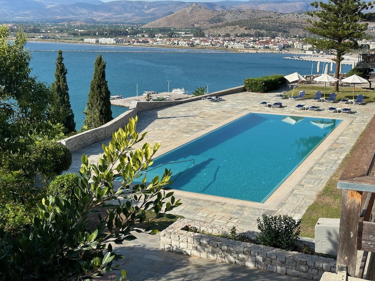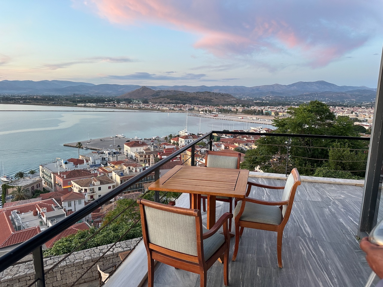 After a drive of an hour or so, we arrived in Nafplio, Greece. We stayed at another posh hotel, the Nafplia Palace. Again, the price of this hotel per night was extremely reasonable compared with U.S. prices. The hotel was built in 1714 inside a fortress, the Palamidi castle, high above the capital city! Every room in the hotel has breathtaking views of Nafplio. And everyone in Nafplio can see the hotel.