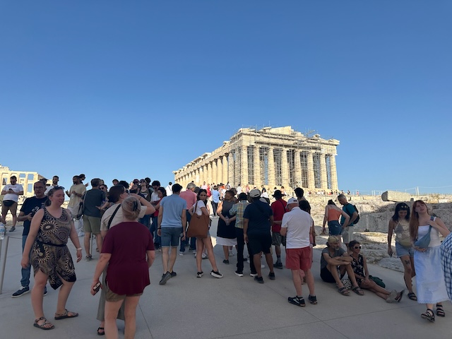 The most important stop of the day, and possibly the entire tour, was to see the iconic Greek Acropolis. Acropolis literally means “high city.” Many ancient cities were built on elevated land, to make them more easily protected. The Greek Acropolis is by far the most important structure in Greek culture and perhaps the most important structure in Western civilization. The Acropolis symbolizes the best of ancient Greek Classical culture — including architecture, art, music, drama and political science.