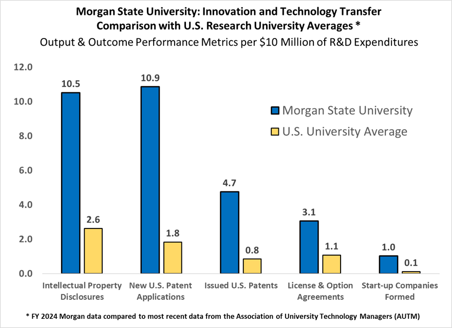 Morgan’s economic engine is also powered by its extraordinary innovation capacity. Compared with the U.S. research university average, Morgan dramatically outpaces its peers, with more than 10 times more start-ups formed, patent filings and licensing activity per $10 million in R&D expenditures, as detailed in the University’s FY24 innovation metrics report.
