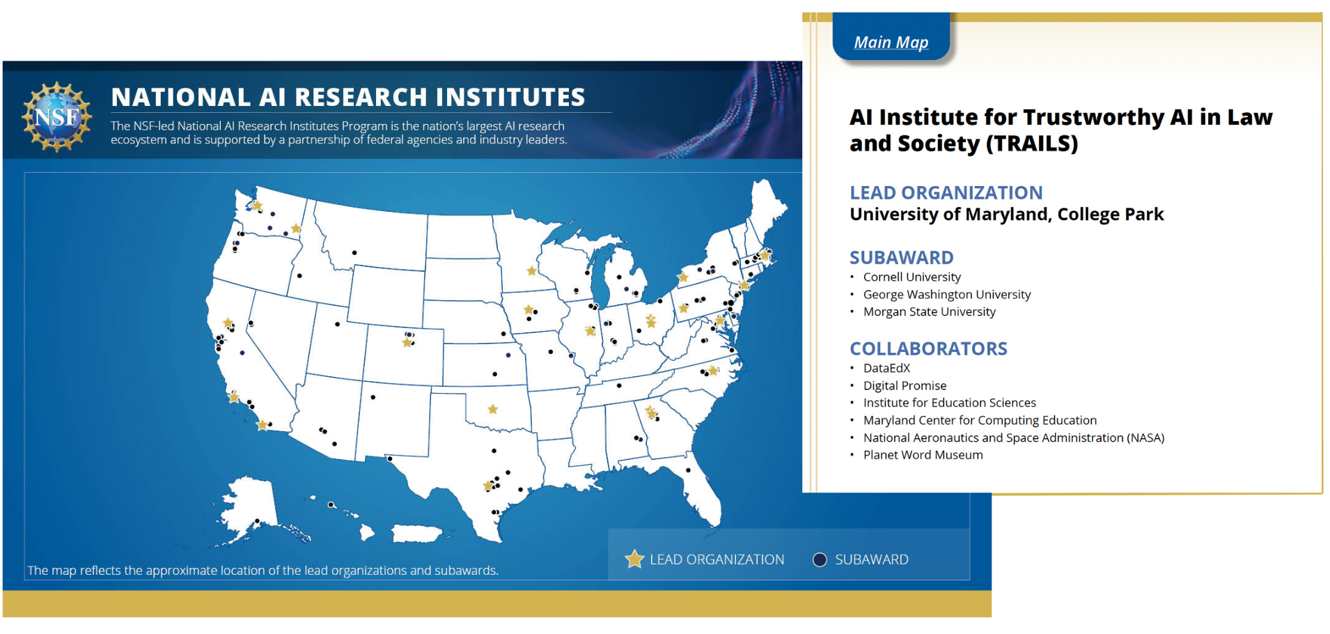 TRAILS is one of seven new national AI research institutes established by NSF as part of its overall $140 million effort to advance a cohesive approach to AI-related opportunities and risks. The AI Institutes will support the development of a diverse AI workforce in the United States and help address the risks and potential harms posed by AI.