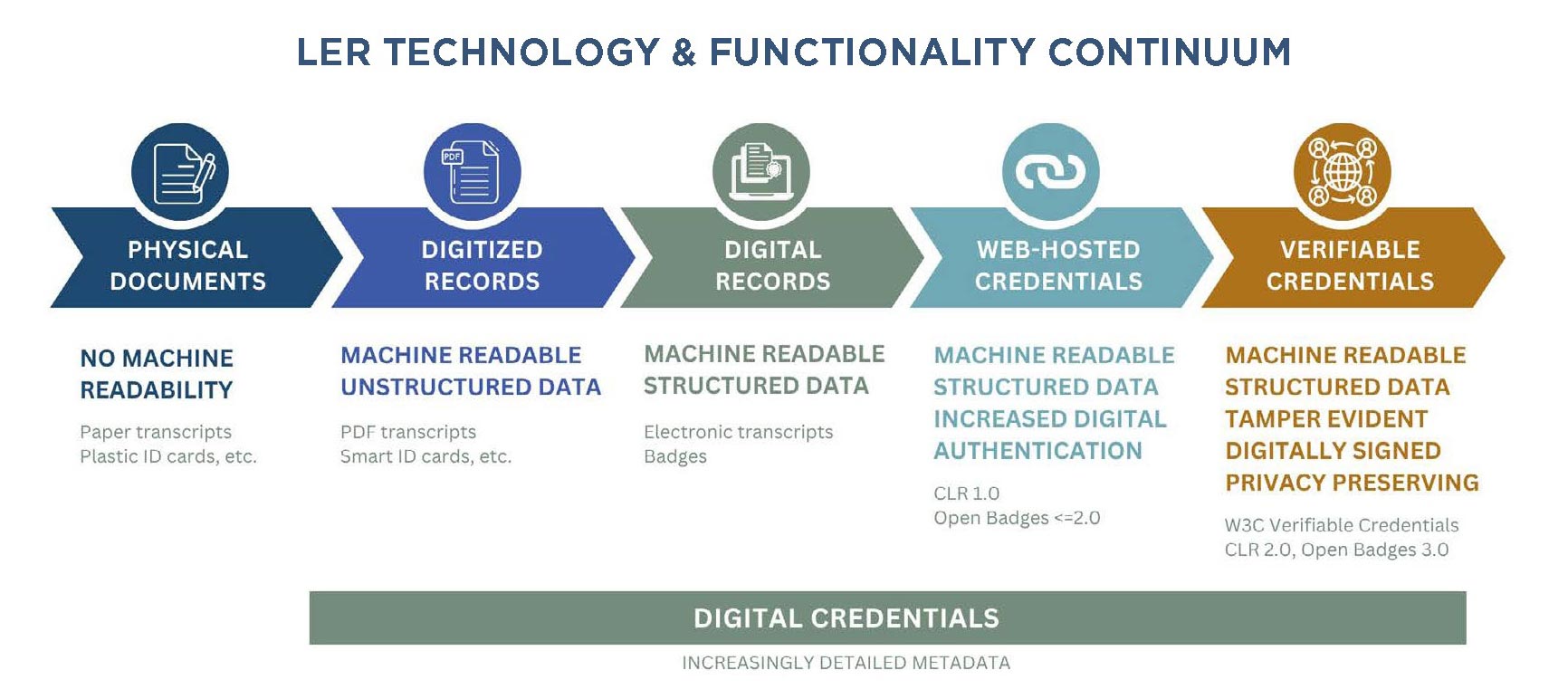 According to a study conducted by the National Association of Colleges and Employers (NACE), 75% of employers consider certificates from colleges and universities to be of higher quality than those offered by industry, company, or online providers. Adopting LERs addresses several inherent challenges in the traditional credentialing model, including unclear expectations from employers, difficulties in managing these systems, outdated technology, and business practices that do not support the development of new digital credentials.