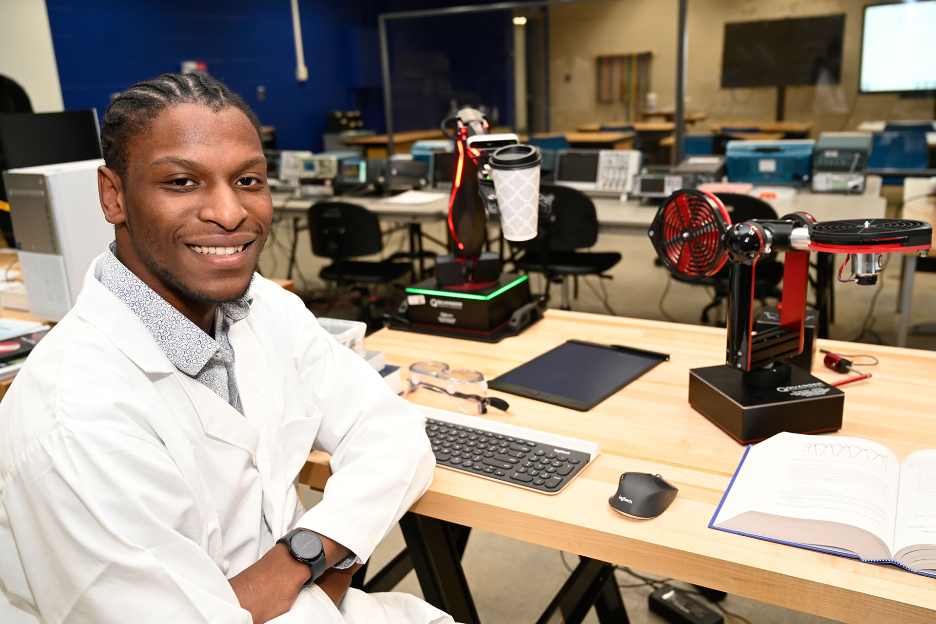 Students such as junior Ethan Joyner are making the most of that support. Joyner, Baltimore-born and a product of the city’s public schools, exudes passion for the subject matter and MSU. He sought to transfer from the computer engineering program at the Community College of Baltimore County the moment he heard Morgan was offering the mechatronics instruction he had long been craving. Joyner has thrived in the well-equipped and growing mechatronics laboratory as one of the program’s best students, Befekadu reports, and he has come to see his career opportunities as limitless. Among his long-term ambitions are to earn a master’s in mechatronics and one day start a free, community-based STEM education program in Baltimore to provide workforce skills training to all comers.