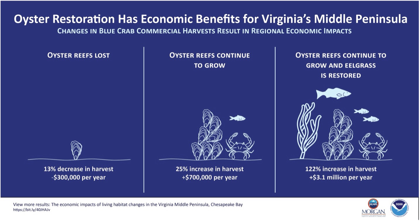 - Oyster reef restoration with continued growth is projected to increase the regional economic impact of the commercial fishing industry by $1.1 million per year and support 12 additional full-time jobs annually.