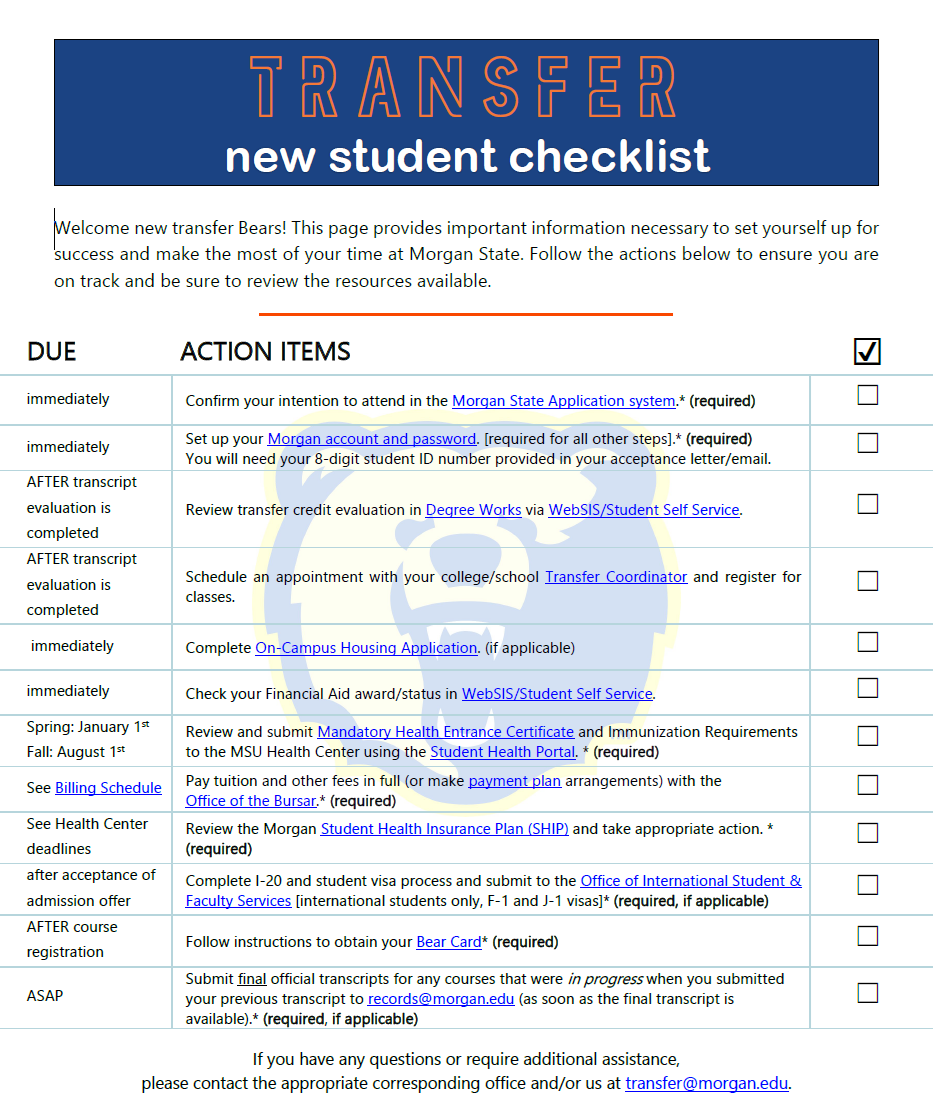 Not able to access the checklist? Contact us at transfer@morgan.edu for assistance.