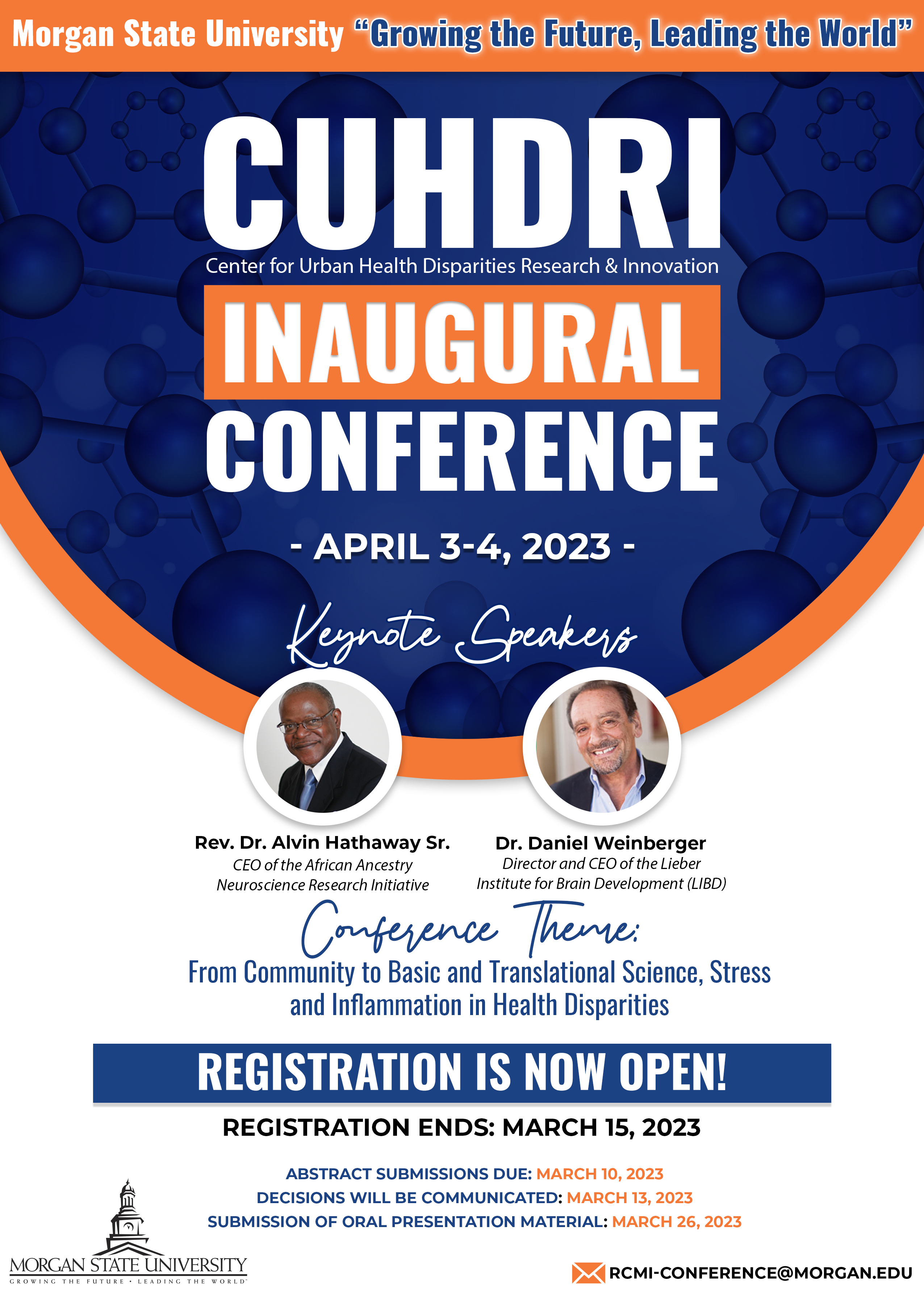 The Center for Urban Health Disparities Research & Innovation (CUHDRI) hosted its Inaugural Conference at Morgan State University on April 3-4, 2023. The theme of this year’s conference was “From Community to Basic and Translational Science, Stress and Inflammation in Health Disparities.” This inaugural event featured speakers from across research and science, federal agencies, community-based partnerships, academia, as well as graduate and undergraduate students from various disciplines.