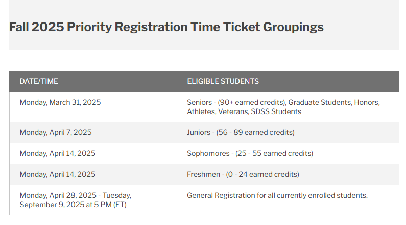 | Date/Time Monday, October 27, 2025 | Eligible Students Seniors - (90+ earned credits), Graduate Students, Honors, Athletes, Veterans, SDSS Students |