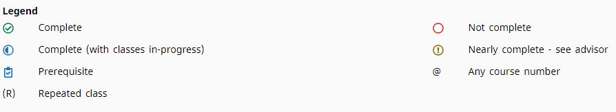 The Degree Works legend, found at the end of your audit, explains the symbols displayed on your audit. To accurately read your degree audit you must know what each symbol means.