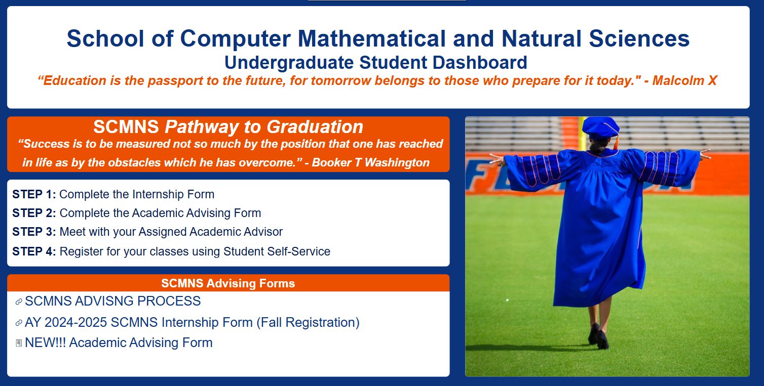 Academic advising is an integral part in your academic journey in the School of Computer, Mathematical, and Natural Sciences (SCMNS). It is a collaborative and interactive process between you and your academic advisor. To enhance your academic advising experience, we have developed a roadmap to guide you through the SCMNS advising process.