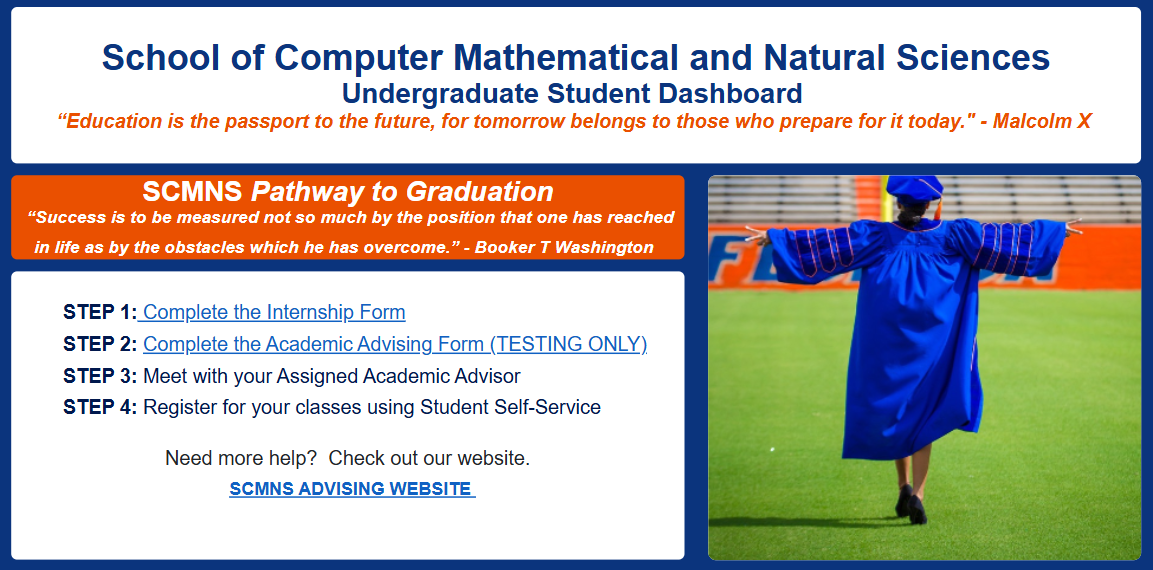 Academic advising is an important component in you successfully completing your degree. As part of the academic advising process in SCMNS, you must complete the Academic Advising Form each semester prior to meeting with your academic advisor.