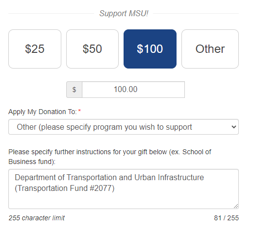 Please note: All general donations will go into the MSU Foundation General Scholarship Fund if not appropriately specified. If you have any questions, please contact the department at transportation@morgan.edu or (443) 885-3348.