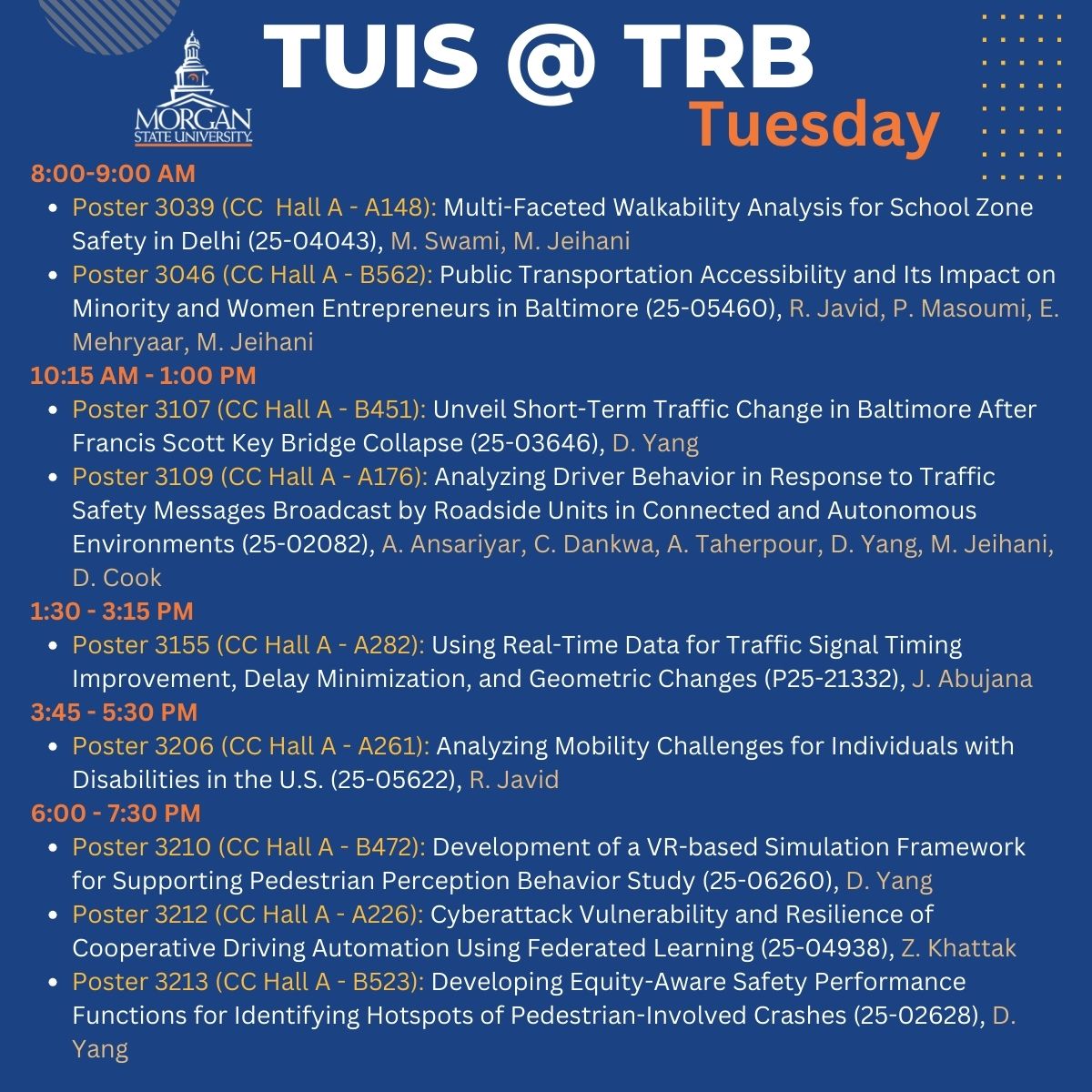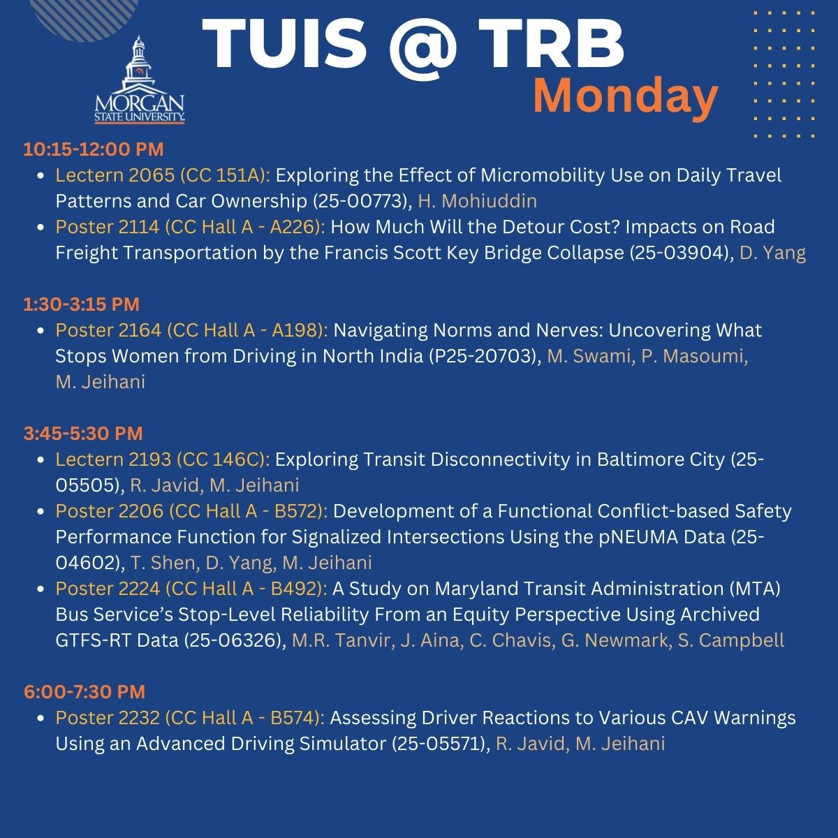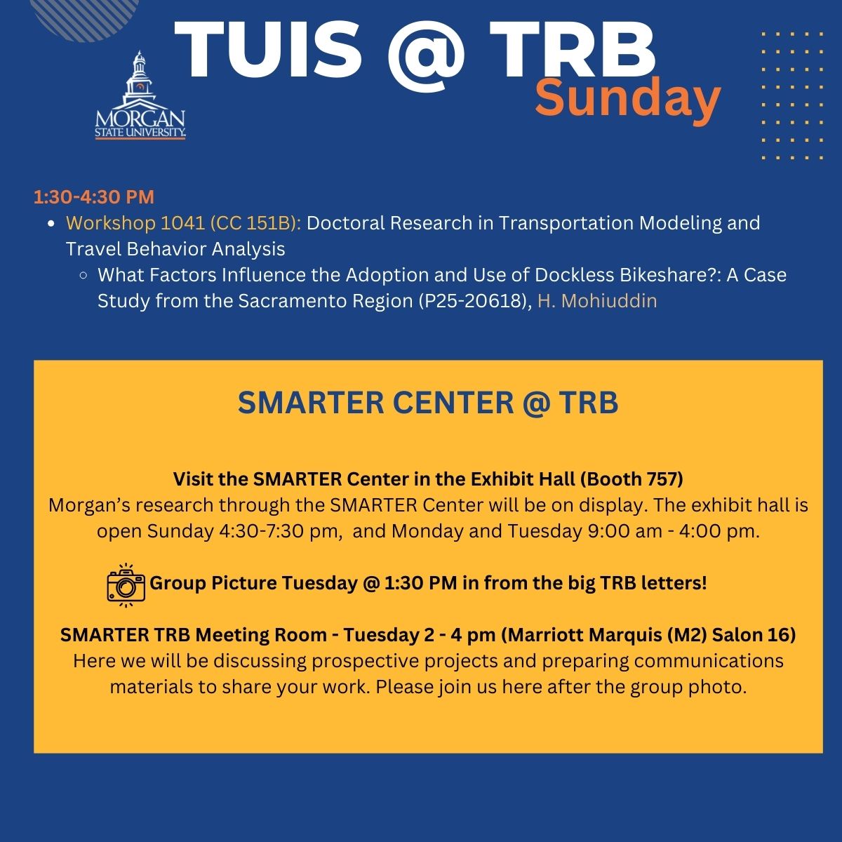 Faculty and students in the Department of Transportation & Urban Infrastructure Studies (TUIS) are sharing their research at the 2024 Transportation Research Board (TRB) Annual Meeting. Please visit us in the Exhibit Hall at Booth #757!