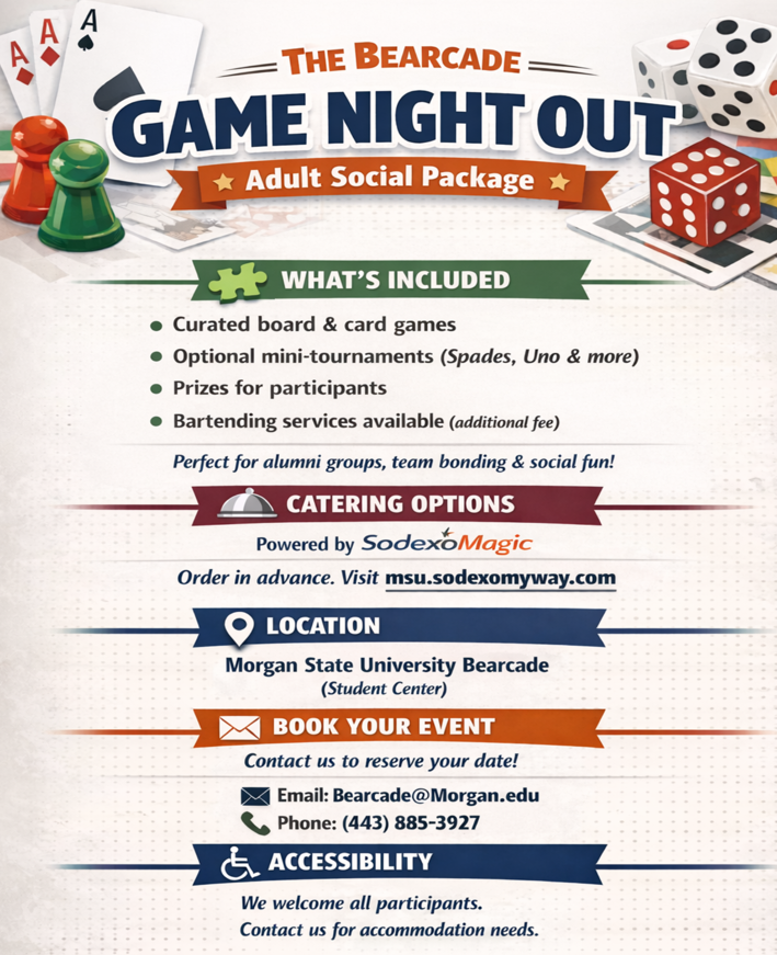 Whether you're planning a casual get together, a competitive gaming tournament, or a one-of-a-kind party experience, the Bearcade has you covered! Below are our rental options, themed event upgrades, and catering packages available through SodexoMagic.